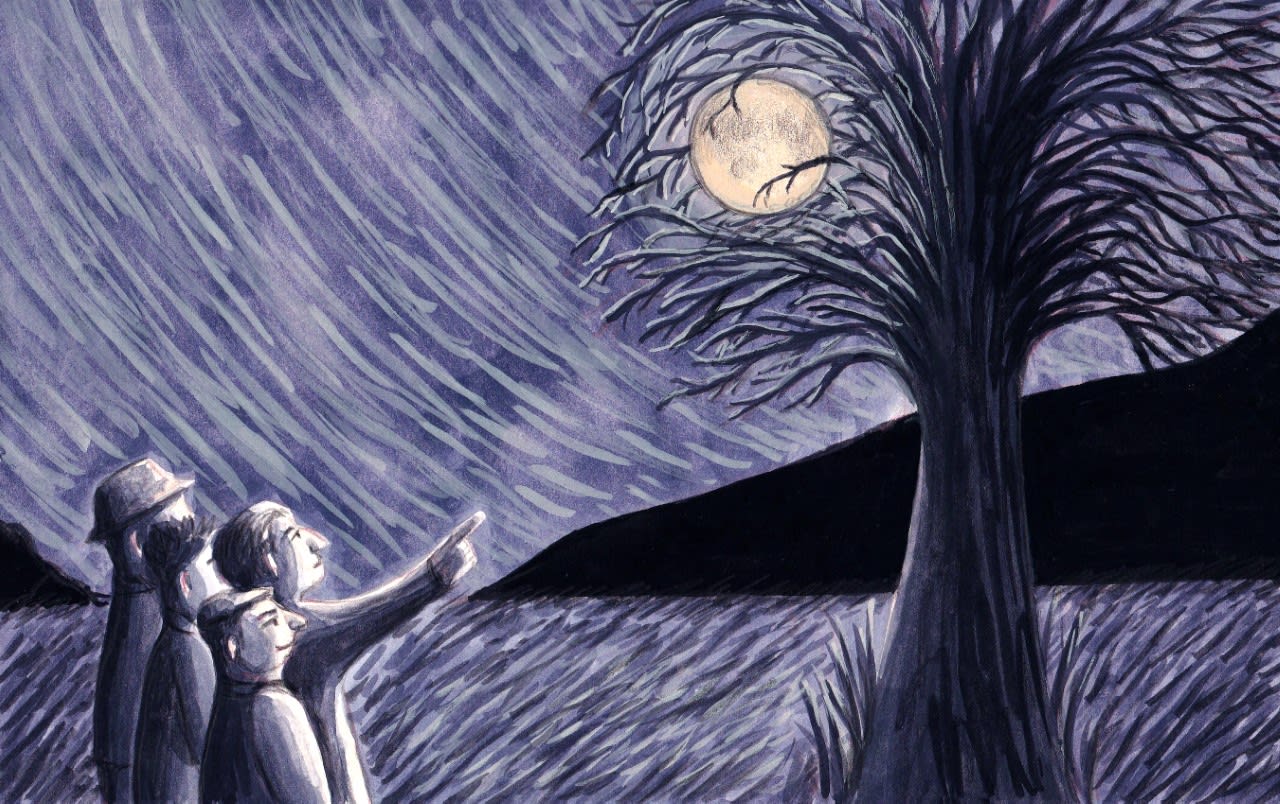 The four young men made sure that the moon was kept topped up with oil, cleaned the wick, and received their payment for doing so every week. Eventually, however, they became old men. When one of them grew ill, and saw that he was about to die, he declared that one quarter of the moon, should, as his property, be laid in the grave with him. When he died, the mayor of the town climbed up the tree, cut off a quarter with some hedge-shears, and placed it in his coffin. The light of the moon decreased, but not visibly.